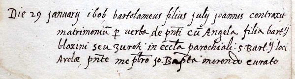 a favore di Zuroti solo che, dopo varie grafie, diventerà il patronimico che conosciamo oggi "ZIROTTI". Questa famiglia, molto antica, sembra essere originaria di Arola poiché già citata nel registro dei matrimoni nel 1606; a questa data, il 29 gennaio, Angela BLAXINI sine ZUROTTI sposa Bartolomeo JOANNIS nella chiesa parrocchiale di S. Bartolomeo di Arola. |