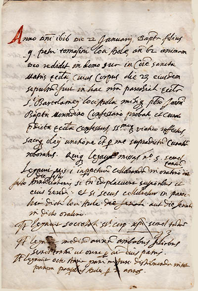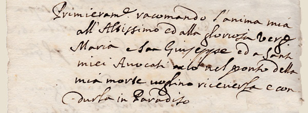 In seguito, ogni testamento si compone d'invocazioni religiose che si presentano nella la forma, "Raccomanda l'anima mia a Dio Padre, all'Altissimo.... La gente pensa che per meritare l'accesso al paradiso, debba rivolgersi prioritariamente a Dio, il giudice supremo all'ora della morte. Questo Dio che si teme, è anche percepito come buono e misericordioso, capace di perdono e di clemenza; è il motivo per cui gli uomini gli raccomandano la loro anima perché è il giudice divino e che dal suo giudizio dipende il futuro della loro anima.. |