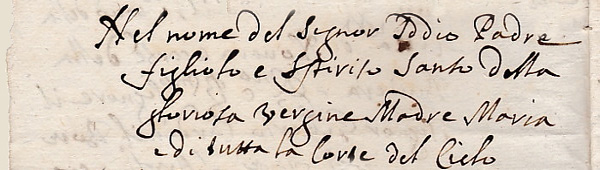 Questa formula ricorda la Trinità di Dio a cui il testatore associa la "Gloriosa Vergine Maria", Madre del Cristo, i Santi e Sante del paradiso "tutta la Corte del Cielo"