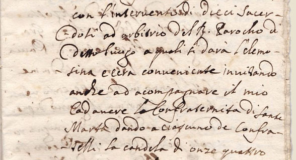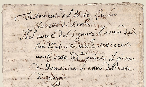 sia più frequentemente da un notaio ( testamento di Don Giulio Ceruetti, parroco ad Arola nel 1709) , che servirà qui di documento di riferimento. Il testamento sia un atto civile che religioso, ma anche di previdenza e di prudenza perché, per gli uomini di questa epoca, è l'ultima possibilità di guadagnare il loro posto nel paradiso, in quale affermano la loro fede ed il loro amore in Dio, spiegano l'organizzazione dei loro funerali ed il luogo della sepoltura, chiedono preghiere, fanno elemosine ai poveri e donazioni alla chiesa. |