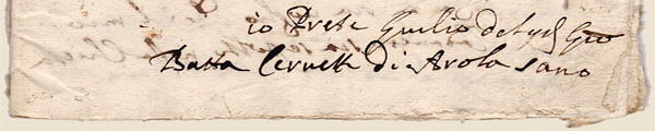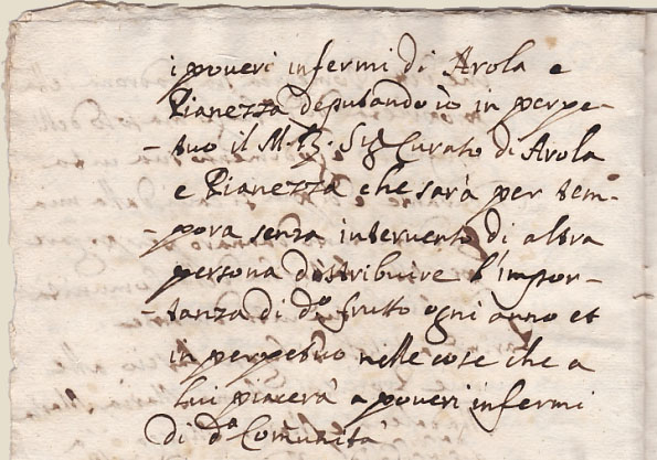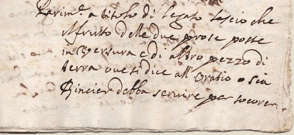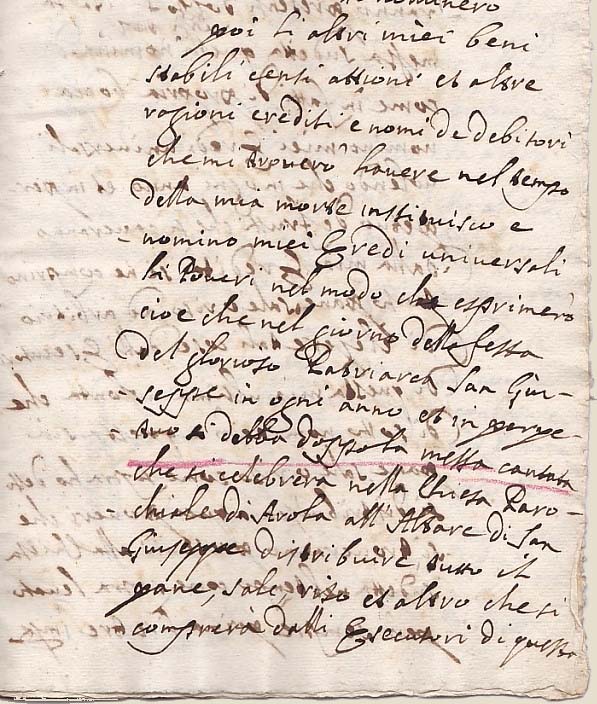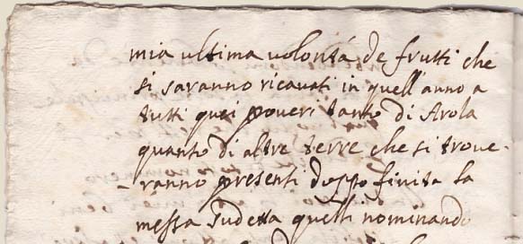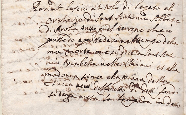 | Nel suo testamento Giulio Ceruetti fa anche delle donazioni pie alla Chiesa, come questi campi localizzati " in Versura " et " Rincier" affinché l'usufrutto sia distribuito dal Parroco della parrocchia agli infirmi della Comunità di Arola e Pianezza. |