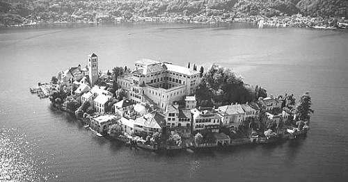 L'isola San Giulio oggi.. Veduta aerea, in cui si individua la disposizione degli edifici, la basilica, il seminario lungo la via anulare. |