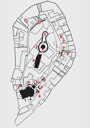 Sulla mappa del Catastro Rabbini (1864), si può notare la presenza dei resti di costruzioni medievali nel tessuto urbano dell'isola San Giulio. 1- Basilica primitiva 2- Torre del castello (Castrum) 3- Recinta del Castrum 4- Luogo del patibolo 5- ?? 6- Luogo del rinvenimento di sarcofagi nel 1688 P- Portali e paramenti murari bassomedievali |
