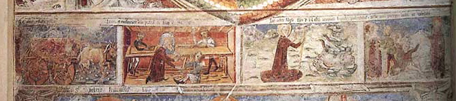 Quando risposero all'uomo di Dio che non mentivano, il santo disse : « Sia dunque seconde le vostre parole. ». Dopo breve cammino fuori di Gozzano i contadini chiamarono il compagno e lo scossero ma quello era morto davvero. Queste ed altre leggende sono ripetute da secoli. ![]() i buoi e il lupo Il pollice del falegname Il Santo cammina sull'acqua Morte del contadino |