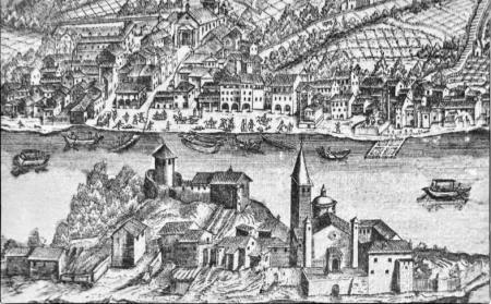 Stampa acquerellata ricavata dell'incisione in rame di J. Ozeni da Soriso. Disegno del Sacro Monte di San Francesco d'Orta e dell'isola San Giulio 1624. Sono in evidenza il "Castrum" in cima all'isola e, ai piedi dello sperone roccioso, una parte dell'insediamento sulla riva occidentale. |